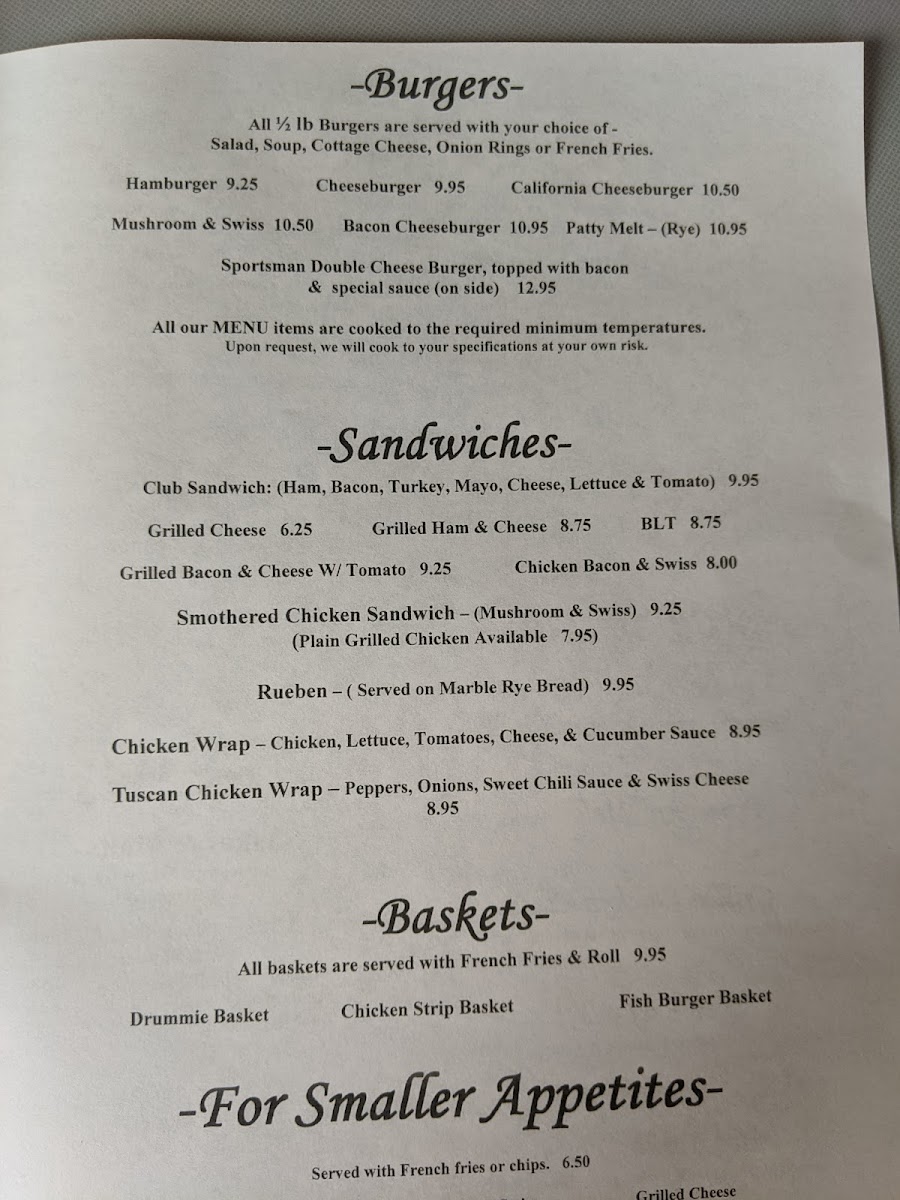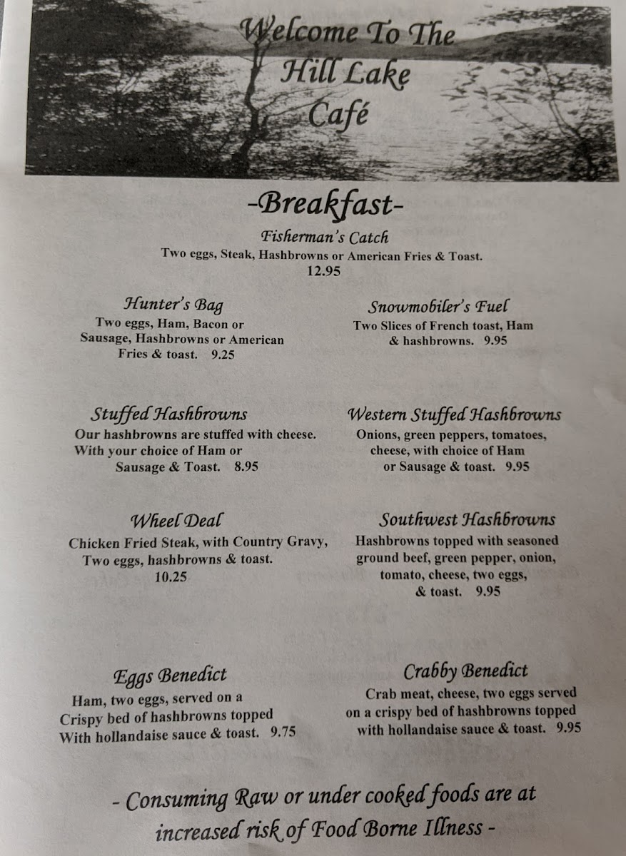 From a reviewer’s perspective, the menu at Hill Lake Cafe Hill feels like a comforting summary of classic American diner food, thoughtfully designed to satisfy both locals and travelers passing through Hill City. The breakfast selection stands out as the heart of the menu, with hearty options such as Fisherman’s Catch, Hunter’s Bag, Stuffed Hashbrowns, Wheel Deal, and Eggs Benedict, all of which set the tone for a filling start to the day. For those who enjoy customizable breakfasts, the Three Egg Omelets-including Taco, Denver Sandwich, Wild Rice Mushroom Omelet, Ham & Cheese, and English Muffin Supreme-offer variety without straying from familiar flavors. Sweet breakfast lovers are well covered with plate-size cakes like Pancake, Blueberry, Apple Cakes, and Sausage Cakes, alongside comforting classics such as Two Slices of French Toast. Moving into lunch and dinner territory, the burger lineup-California Cheeseburger, Hamburger, Cheeseburger, Mushroom & Swiss, and Bacon Cheeseburger-delivers exactly what you expect from a casual lakeside café. The sandwich options, including Club Sandwich, Grilled Cheese, Grilled Ham & Cheese, Grilled Bacon & Cheese w/ Tomato, and Smothered Chicken Sandwich, add balance and choice for lighter meals. Basket meals like the Chicken Strip Basket and Fish Burger Basket round out the menu nicely, while breakfast à la carte items such as Ham, Hash Browns, American Fries, Carmel Rolls, and Cinnamon Rolls allow diners to tailor their plates. Overall, the menu feels complete, approachable, and consistent-serving as a satisfying conclusion to the dining experience with no unnecessary complexity, just reliable comfort food done right.